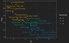 library(ggplot2)thematic::thematic_on(bg ="#222222",fg ="white",accent ="#0CE3AC",font ="Oxanium")ggp<-ggplot(mtcars,aes(wt, mpg,label =rownames(mtcars),color =factor(cyl)))+geom_point()+ ggrepel::geom_text_repel()ggp