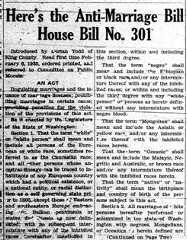 The bill introduced by King County representative Dorian Todd would have outlawed marriage between whites and nonwhites. The most curious part of the bill is its definition of white as "persons whose ancestral lineage can be traced to inhabitants of any European country which had a political existence, or a national identity, or racial distinction as a self-governing state prior to 1800, except those of Eastern and southeastern Europe embracing the Balkan peninsula or states, and Russia as now delineated…"