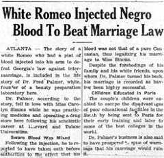 During the 1935 efforts to block the anti-miscegenation legislation, theNorthwest Enterprise, covered two related nationwide stories on attempts to prevent interracial relationships, punctuating the importance of protecting the existing civil rights within WashingtonState . One article told of the extremes that others across the nation would go in order to overcome discriminatory marriage laws. Weeks after the introduction of the bill in Olympia , the paper reported on a white “Romeo” who had a “pint of blood injected into his arm to defeat Georgia ’s law against intermarriage.”10 Following the injection, the man took an oath before authorities, testifying that he did not have pure Caucasian blood, thus legalizing his marriage. The article goes on to inform readers that this “Romeo,” Dr. Fred Palmer, found good fortune in his life following this decision, that “despite the forebodings of his family and his white friends, upon whom Dr. Palmer turned his back, his marriage is recorded as having been highly successful.” Furthermore, it reported that, “Dr. Palmer’s business is also said to have prospered in spite of warnings that his marriage would ruin it.”11