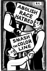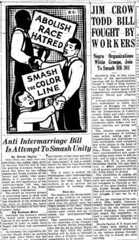 The Communist Party used its newspaper, theVoice of Action, to highlight its opposition to the 1935 miscegenation bill. It set itself apart from its coalition partners by arguing that the bill was not only racist, but also anti-labor and anti-working people. One report mentioned that one month before the end of the legislative session, a mass meeting of the Citizens’ Committee received a telegram that unofficially told the group that House Bill No. 301 would be killed. The report of this event is telling on several accounts of the wider framework of action, and of labor’s self-promotion. The paper goes on to praise itself, as it writes, “it was not an accident that the telegram came to theVoice of Action, but that it clearly showed what a force the militant white workers, liberals and the intellectuals had been in the fight to smash the bill.”21 However, despite this apparent victory, the article entitled “Continued Pressure urged on Todd Bill” cautioned against giving up the fight without assurance that they had won. Before elaborating on the good news, the editors warned that rather than relying on lobbying alone, “the chance of killing the bill will undoubtedly depend upon the continuation of wide mass protest…we recommend redoubled protest as a safe guarantee that victories won to date…are not lost.”22 TheVoice of Action went to great lengths to accentuate the connection between the need to fight the anti-miscegenation bill and work in common cause with white laborers. One article commented, “How Negro-hating goes hand-in-hand with labor-hating, and why reactionaries use one to split the other, was shown this week by the action of Representative Dorian E. Todd, introducer of the vicious Todd anti-intermarriage bill.”23