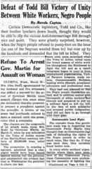 Following the defeat of the 1935 bill, the _Voice of Action_compared Todd and other legislators in support of the measure to a lynch mob. It congratulated its readers on their successful efforts. It also largely credited itself and militant organized labor for the victory on behalf of African Americans. The paper reported that politicians underestimated the protest that would arise over the Todd Bill, and, in plain language, stated, “The mistake these fine gentlemen made was in forgetting the Communist Party.” The article further commented, “Maybe they thought that we Communists just talk of defending the rights of the Negro people in order to catch votes, like they do. If that was their idea, they certainly know better now…the Negro people can plainly see that they have a true friend in the white toilers” again, framing themselves as the defender of African Americans.24