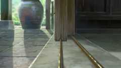 ラストと並んで電車という舞台装置がもっとも効果的に用いられているシーンの一つは、三葉が(中学生の)瀧に組紐を手渡す場面である。そこでは閉まる直前の電車ドアの隙間を縫って伸びる組紐のイメージが、電車の内と外という形で象徴的に分断された二人の時空間を繋ぎあわせるべく機能している。映画内には他にも扉の開閉を大写しで見せる場面がいくつか存在しており(三葉の部屋の障子、宮水家の玄関戸、新幹線の扉など)、それらはこのシーンのための視覚的な伏線となっている[図16]。