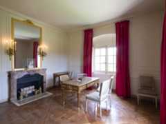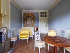 This second bedroom, with its simple, moulded wood panelling and fireplace of painted stone and fake marble, is designed to look like the bedroom of Marie Thérèse Charlotte, known asMadame Royale, daughter of Louis XVI and Marie-Antoinette, who resided on this floor.