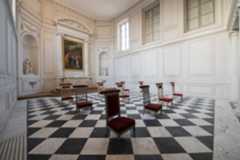 This grand dining room, where Louis XV dined for the first time on 11 September 1769, was able to accommodate 50 guests. Its discreetly luxurious décor is entirely dedicated to nature. The wood panelling, by Honoré Guibert, and the Turquin blue marble fireplace by Jacques-François Dropsy, are decorated with laurels and garlands of fruit and flowers.