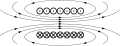 | Source code InfoField | Python code# paste this code at the end of VectorFieldPlot 3.3# https://commons.wikimedia.org/wiki/User:Geek3/VectorFieldPlotdoc=FieldplotDocument('VFPt_Solenoid_correct2',width=490,height=200,unit=100,commons=True,bg_color=None)doc.arrow_geo={'x_nock':-2,'x_head':4,'x_tail':-2,'width':4}R=0.49L=1.96field=Field([['coil',{'x':0,'y':0,'phi':0,'R':R,'Lhalf':L/2,'I':1}]])forain[-0.455,-0.385,-0.275,-0.165,-0.055,0.055,0.165,0.275,0.385,0.455]:line=FieldLine(field,[0,a],directions='both',maxr=3.5)doc.draw_line(line,linewidth=1.0,arrows_style={'dist':1.5,'min_arrows':1,'max_arrows':3,'scale':2,'offsets':{'start':1,'leave_image':0.25,'enter_image':0.25,'end':1}})current_out=doc.draw_object('g',{'id':'current_out'},group=doc._get_defs())doc.draw_object('circle',{'cx':'0','cy':'0','r':12.5,'fill':'#ffffff','stroke':'#000000','stroke-width':3},group=current_out)doc.draw_object('circle',{'cx':'0','cy':'0','r':2.6,'fill':'#000000','stroke':'none'},group=current_out)current_in=doc.draw_object('g',{'id':'current_in'},group=doc._get_defs())doc.draw_object('circle',{'cx':'0','cy':'0','r':12.5,'fill':'#ffffff','stroke':'#000000','stroke-width':3},group=current_in)doc.draw_object('path',{'d':"M -8.8,-8.8 L 8.8,8.8 M -8.8,8.8 L 8.8,-8.8",'fill':'none','stroke':'#000000','stroke-width':3},group=current_in)forxinsc.linspace(-0.84,0.84,7):doc.draw_object('use',{'{http://www.w3.org/1999/xlink}href':'#current_out','transform':"translate({:.3f},{:.3f}) scale(0.01, 0.01)".format(x,R)})doc.draw_object('use',{'{http://www.w3.org/1999/xlink}href':'#current_in','transform':"translate({:.3f},{:.3f}) scale(0.01, 0.01)".format(x,-R)})doc.write() |