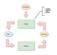 WhileState represents where the system is at a given time,Event represents a trigger for state change, and aReducer is the pure function that changes the state depending on current state and type of event received, there is not as of yet any type to emit events given a particular current state. That's the job of theFeedback. It's essentially a "processing engine", listening to changes in the currentState and emitting the corresponding next events to take place. It's represented by a pure function with a signature ofSignal<State, NoError> -> Signal<Event, NoError>. Feedbacks don't directly mutate states. Instead, they only emit events which then cause states to change in reducers.