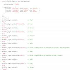 constlog=s=>console.log(s);log(TrafficLight.state());// 'Red'Machine.transition('Green');// truelog(TrafficLight.state());// 'Green'