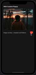 importReactfrom'react';import{Image,StyleSheet,Text,View}from'react-native';importAnimatedButtonfrom'@nithinpp69/react-native-animated-button';conststyles=StyleSheet.create({container:{flex:1,backgroundColor:'#171517',alignItems:'center',},title:{color:'white',fontWeight:'bold',fontSize:18,marginBottom:15,textAlign:'left',width:'90%',},image:{width:'90%',height:250,borderRadius:15},row:{width:'90%',flexDirection:'row',alignItems:'center',justifyContent:'space-between',paddingTop:15,},courtesy:{color:'white',fontSize:15},icon:{width:35,height:35},});constApp=()=>{return(<Viewstyle={styles.container}><Textstyle={styles.title}>Without Custom Popup</Text><Imagesource={{uri:'https://images.unsplash.com/photo-1634938971687-1082b4cb018c?ixid=MnwxMjA3fDB8MHxwaG90by1wYWdlfHx8fGVufDB8fHx8&ixlib=rb-1.2.1&auto=format&fit=crop&w=1170&q=80',}}style={styles.image}/><Viewstyle={styles.row}><Textstyle={styles.courtesy}> Image courtesy : Unsplash and FlatIcon</Text><AnimatedButton><Imagesource={{uri:'https://cdn-icons-png.flaticon.com/512/6685/6685820.png',}}style={styles.icon}/></AnimatedButton></View></View>);};exportdefaultApp;