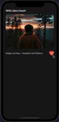 importReact,{useState}from'react';import{Image,ImageBackground,StyleSheet,Text,View}from'react-native';importAnimatedButtonfrom'@nithinpp69/react-native-animated-button';conststyles=StyleSheet.create({container:{flex:1,backgroundColor:'#171517',alignItems:'center',},title:{color:'white',fontWeight:'bold',fontSize:18,marginBottom:15,textAlign:'left',width:'90%',},image:{width:'90%',height:250,borderRadius:15},row:{width:'90%',flexDirection:'row',alignItems:'center',justifyContent:'space-between',paddingTop:15,},courtesy:{color:'white',fontSize:15},flyingContainer:{color:'white',fontSize:18,fontWeight:'bold'},icon:{width:35,height:35,alignItems:'center',justifyContent:'center',},likesCount:{color:'black',fontSize:18,fontWeight:'bold',},});constApp=()=>{const[likeCount,setLikeCount]=useState(0);return(<Viewstyle={styles.container}><Textstyle={styles.title}>With Likes Count</Text><Imagesource={{uri:'https://images.unsplash.com/photo-1634938971687-1082b4cb018c?ixid=MnwxMjA3fDB8MHxwaG90by1wYWdlfHx8fGVufDB8fHx8&ixlib=rb-1.2.1&auto=format&fit=crop&w=1170&q=80',}}style={styles.image}/><Viewstyle={styles.row}><Textstyle={styles.courtesy}> Image courtesy : Unsplash and FlatIcon</Text><AnimatedButtonrenderFlyingContainer={()=>(<Textstyle={styles.flyingContainer}>+1</Text>)}onPress={()=>{setLikeCount(count=>count+1);}}><ImageBackgroundsource={{uri:'https://cdn-icons-png.flaticon.com/512/6685/6685820.png',}}style={styles.icon}><Textstyle={styles.likesCount}>{likeCount}</Text></ImageBackground></AnimatedButton></View></View>);};exportdefaultApp;