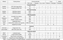 Year Paper link Code [arXiv20] UR2KiD: Unifying Retrieval, Keypoint Detection, and Keypoint Description without Local Correspondence Supervision arXiv - [CVPR19] ContextDesc: Local Descriptor Augmentation with Cross-Modality Context - Github [CVPR19] From Coarse to Fine: Robust Hierarchical Localization at Large Scale with HF-Net arXiv Github [ICCV17] Large-Scale Image Retrieval with Attentive Deep Local Features (DELF) - Github