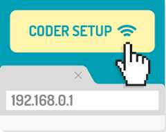 On your computer, join the new WiFi network "CoderConfig," then visit http://192.168.0.1/ in Chrome, and follow the on-screen instructions.