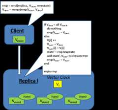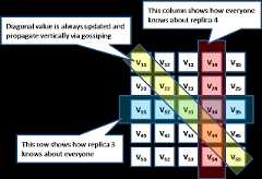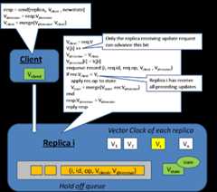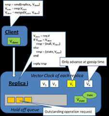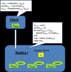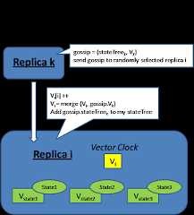 - Whenever replica i send a message to replica j, it will first advance its clock Vi[i] and attach its vector clock Vi to the message