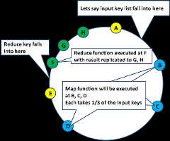 The system will push the map and reduce function to all the nodes (ie: moving the processing logic towards the data). The map function of the input keys will be distributed among the replicas of owning those input, and then forward the map output to the reduce function, where the aggregation logic will be executed.
