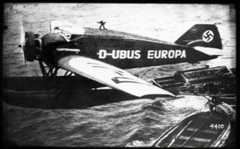 In 1932 the W34 design was reviewed for a special utilization by Luft Hansa for postal flights launched from the NDL steamliners "Europa" and "Bremen". These postal flights were already performed since summer 1929 withHeinkel He 12 andHeinkel He 58 aircraft. Special catapults were installed on board the two transatlantic ocean liners, from which the aircraft was launched with postal cargo about 1000km in front of the coast. These advanced postal flights reduced the travelling time of the postal cargo by about one day. In 1932 Luft Hansa was looking for more modern aircraft designs for these missions. Due to the good experience from the W34, they asked Junkers to make this aircraft usable for catapult take offs.Zindel andPohlmann started the design under the designatorJu 46. Compared to the original W34, the Ju 46 got a more strengthened structure for the catapult forces and a larger tail unit. The Ju46 was first flown in March 1932 and in April 1932 the D-2244 was assigned to the steamliner "Europa". These Ju46s were painted in a red livery, so that they could be discovered in case of an emergency landing on sea. Due to the improved range of the Ju46, catapult take offs now could be performed about 1500 km in front of the coast. They flew to New York on westbound routes, while on eastbound routes they landed at Southampton for a refuelling stop and then continued to Bremen. The Ju46s used on these transatlantic routes were typically used for one summer season. Due to massive corrosion problems they were then replaced by new aircraft. A total of five Ju46s were built until 1933
