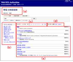 「キーワード検索」または「分類記号検索」を実行すると、図4に示すように検索結果を一覧形式で表示します。画面は、(a)検索条件、(b)絞り込み検索(典拠種別)、(c)ページ送り、(d)表示件数、(e)検索結果の5つのパートに分かれています。以下、各パートについて順番に説明します。