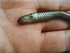 After 2-7 years, the ammocoetes undergo a metamorphosis lasting several months and then journey out to sea as adults, growing up to 30 inches long, where they feed by attaching their jawless mouthparts onto fish and other vertebrates, drawing blood and other body fluids without killing the host.After 1-3 years at sea, lamprey return to fresh water streams where the female may spend a week or more preparing her “redd” or egg repository, arranging rocks on the stream bed to her precise specifications before depositing up to 100,000 eggs which are later fertilized by the male.