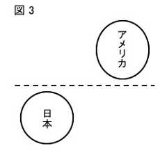 大きな原因の一つと思われるのが反米図式である。戦後すぐの日米関係は、図3のようなものだっただろう。圧倒的に豊かで強いアメリカと、貧しくて弱い日本である。ここにおいて、日本の側に立ってアメリカとたたかう立場は、世界を横に切って「下」に味方する左翼の図式にすんなりとはまっていた。