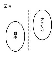 しかし、やがて日本はアメリカに匹敵する経済大国になり、他方でアメリカも中間層が分解して膨大な貧困者の実態が伝わるようになってくる。すなわち、図4のようになったのである。ここで反米の立場に立つ人々は、あいかわらず自分達は左翼であり基本的に転向していないつもりでいたのだが、実際にはいつの間にか日米関係を縦に割って考え、「ウチ」に味方する立場に立っていたのである。この場合は、「逆右翼」どころか本質的には真正の右翼である。