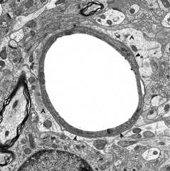 Unlike other organs and tissues, theendothelial cells that line brain capillaries have no fenestrations or pinocytotic (transportation) vesicles and havetightand adherens junctions that almost fuse adjacent endothelial cells. Moreover, these endothelial cells have different receptors and ion channels on their surface facing the lumen than on the surfaces facing the brain, an arrangement that facilitates transcellular transport. This anatomy is the basis of theblood-brainbarrier (BBB). The endothelial cells are surrounded by abasement membrane made up of collagens, laminins, and proteoglycans. A discontinuous layer of pericytes are embedded in this basement membrane.Astrocytic processes rich in Aquaporin 4 (AQP4) cover the capillaries. The space between them and the capillary basement membrane contains a few perivascular macrophages and rare lymphocytes that cross the BBB (passing through endothelial cells rather than between them) and survey this space. The same types of cells are present in the perivascular (Virchow-Robin) space (see below). Brain endothelial cells do not express leukocyte adhesion molecules (LAMs) on their luminal surface and this limits the entry of leukocytes into brain tissue. In non-diseased states, no immune cells or molecules are found deeper in brain interstitial space, resulting in an “immune privileged” status. During development, astrocytes induce brain endothelial cells to develop in this special leak-proof fashion.