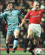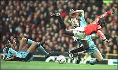 And Cole further justified his selection ahead of £12.6million Yorke - who has found the target only five times in his last 18 games - ten minutes after the interval. Unmarked in the six-yard box, he rose to head home a David Beckham free-kick for his 17th of the season. But Coventry - still searching for their first awaywin in the Premiership this season - did not leave Old Trafford without a fight. Cedric Rousell pulled a goal back just after the hour mark although the gap was not closed for long. Scholes, also restored to the line-up after an absence, announced his return on 76 minutes, firing home a 25-yarder for his sixth of the season. With United's two-goal lead restored, the three points were never in doubt. Roussel scored a well-taken second goal in the final minute to make it 3-2 but injury-hit Coventry were well-beaten. Teams: Man Utd:Bosnich, G. Neville, Stam, Silvestre, P. Neville,Beckham, Keane, Scholes, Solskjaer, Cole, Sheringham. Subs:Van Der Gouw, Irwin, Yorke, Butt, Cruyff. Coventry:Hedman, Telfer, Williams, Breen, Shaw, Gustafsson,Palmer, McAllister, Froggatt, Keane, Roussel. Subs: Ogrizovic,Konjic, Strachan, Eustace, Delorge. Referee: A Wilkie (Chester Le Street) |