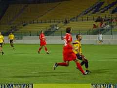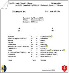 Ma veniamo al calcio giocato. Indisponibili Milanetto, Mauri, Amoruso, Giosa, Music e con Kamara in panchina, Pioli schiera lo stesso undici di Sassuolo. Renard tra i pali, difesa a quattro con Pivotto, Ungari, Mayer e Tamburini; a centrocampo Tisci in regia affiancato da Campedelli con Manu e Di Venanzio sugli esterni. In attacco conferma per il tandem Vignaroli-Fabbrini. Malgrado un clima tropicale, l'inizio di partita è raggelante. Infatti, dopo solo 4', la Triestina è già in vantaggio: Soligo dalla destra pesca l'accorrente Princivalli che, in tutta tranquillità dall'altezza del dischetto, non dà scampo a Renard. Difesa gialloblù non pervenuta e grande gioia dello sparuto gruppo di tifosi alabardati presenti in curva nord. Il pugno nello stomaco fa male ma il Modena non si scompone e reagisce immediatamente. All'8' Pivotto scodella un invitante pallonetto in area, prepotente incornata di Di Venanzio e miracolo di Campagnolo che respinge coi pugni. Il vivace Manu inizia a carburare sulla fascia destra, sull'altra corsia Di Venanzio fa il bello e il cattivo tempo. Ed è ancora l'ex ascolano a farsi vivo con una bordata (11') che Campagnolo smanaccia in angolo. La Triestina concede spazi a centrocampo e il Modena insiste: al 19' ci prova Manu ma il suo tiro è debole e centrale, al 23' è Fabbrini a mandare alle stelle da due passi. Gli alabardati si affidano al contropiede e al 25' la difesa gialloblù , messa sotto pressione dal quotato tandem d'attacco Godeas-Moscardelli, si fa nuovamente sorprendere: a salvare capra e cavoli ci pensa Renard che, con la punta delle dita, manda in angolo una conclusione ravvicinata di Princivalli. Al 37' Tisci si esibisce in una bella punizione dai venti metri che esce di un soffio sopra la traversa mentre al 45' una conclusione a botta sicura di Pivotto è rimpallata da un difensore triestino. L'inizio di ripresa si apre con un fendente di Vignaroli sventato dal solito Campagnolo. Al 58' Campedelli reclama un rigore per una spinta di Parola e, dopo il quarto d'ora, Pioli getta nella mischia Kamara e Allegretti per gli applauditi Di Venanzio e Manu. Il franco-senegalese si fa subito notare con un cross radente sul quale Bianchi sfiora l'autogol. Ma alla mezzora è la Triestina a mancare il raddoppio: Baù, con una punizione bomba, centra il palo alla sinistra di Renard. Il Modena non ci sta a perdere e si getta generosamente in avanti anche se le gambe sono pesanti e le idee confuse. Proprio nell'ultimo dei 4' di recupero , prima Vignaroli e poi Ponzo ritardano la conclusione a due passi da Campagnolo. Finisce 1-0 per la Triestina ma i gialli escono tra gli applausi. La partita da vincere è quella che si giocherà da mercoledì a Milano negli uffici della Lega.