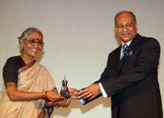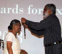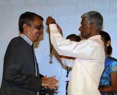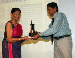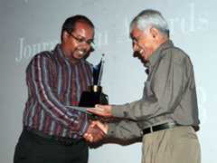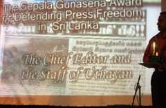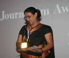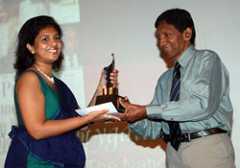 The occasion was extra-special because it was also the 10th anniversary of the awards. The Sunday Times won four awards including the ‘Denzil Peiris Young Reporter of the Year’ which was bagged by Isuri Kaviratne and the Merit award of the ‘Mervyn de Silva Journalist of the Year’ which was secured by Christopher Kamalendran, along with two others. Five Lifetime Achievement Awards were presented by the Editors’ Guild to veterans pictured here. The top prize, the ‘Mervyn de Silva Journalist of the Year’ as well as several others were not awarded. Amidst the celebrations there was a moment of poignant silence for Sirisa reporter Rashmi Mohammed who had paid the supreme price – dying in a bomb attack while doing his duty at Anuradhapura. He was honoured with the ‘D.R. Wijewardene Award for Earning the Appreciation of Peers and Public’ posthumously. The Sepala Gunasena Award for Defending Press Freedom in Sri Lanka went to the Chief Editor of Uthayan (Jaffna), M.A, Kaanamylnathan and his staff. The annual Journalism Awards are organized by The Editors’ Guild of Sri Lanka (TEGOSL) and the Sri Lanka Press Institute (SLPI). Here is the list of winners: Mervyn de Silva Journalist of the Year Winner: Not awarded Merit Award: D. Charles Peter of Metro News Christopher Kamalendran of the Sunday Times Janyitha Seneviratne of the Sunday Divaina Business Journalist of the Year (Sinhala):Shyam Nuwan Ganewatte of the Sunday Divaina Business Journalist of the Year (Tamil): Niranjani Roland of Metro News Business Journalist of the Year (English): Bandula Sirimanna of the Sunday Times Upali Wijewardene Feature Writer of the Year (Sinhala): Sanda Laalith Ranasinghe of Silumina Upali Wijewardene Feature Writer of the Year (Tamil): Niranjani Roland of Metro News Upali Wijewardene Feature Writer of the Year (English): Randima Atygalle of the Nation Merit : Chamitha Kuruppu of LakbimaNews B.A. Siriwardena Columnist of the Year (Sinhala): Not awarded B.A. Siriwardena Columnist of the Year (Tamil): B. Kirubaharan of Thinakkural B.A. Siriwardena Columnist of the Year (English): Nanda Pethiyagoda Wanasundere of the Sunday Island Best Environmental Reporter of the Year: Nimashi Amaleeta of the Nation Subramaniyam Chettiar Social Development Reporter of the Year: K. Ponmalar of Metro News Merit: Asuntha Sivumini Edirisooriya of the Sunday Lankadeepa Sports Journalist of the Year: Channaka de Silva of the Daily Mirror Cartoonist of the Year: Wasantha Siriwardena of the Nation Photojournalist of the Year: Dinuka Liyanawatte of the Daily Mirror Merit: Nishan S. Priyantha Best Designed Newspaper of the Year: The Sunday Times Merit: Daily Mirror & Ravaya Scoop of the Year Award: Not awarded Denzil Peiris Young Reporter of the Year: Isuri Kaviratne of th Sunday Times Prof. K.A. Kailasapathy Award for Reporting under Special Circumstances: Not awarded Investigative Journalist of the Year: Dr. Prasanna Cooray of the Island Sepala Gunasena Award for Defending Press Freedom in Sri Lanka: The Chief Editor and staff of Uthayan D.R. Wijewardene Award for Earning the Appreciation of Peers and Public: The late Rashmi Mohammed of Sirasa Lifetime Achievement Awards for Long and Distinguished Service to Sri Lanka: Anula de Silva, P. Balasingham, Louis Benedict, Thalangama Jayasinha and S. Shanmugarajah  |  | | Louis Benedict receiving his gold medal from Tilekeratne Kuruwita Bandara | P. Balasingham receiving his medal from Manik de Silva | |  | | Anula de Silva receiving her medal from Sundara Nihatamani de Mel | Thalangama Jayasinha receiving his medal from Sarath Cooray |  |  | | S. Shanmugarajah receiving his medal from A. Sivanesaselvan | Young Reporter of the Year, Isuri Kaviratne of the Sunday Times, receiving her award from Prabath Sahabandu, Editor of the Island. |  |  | | D. Charles Peter | Christopher Kamalendran | | | Mervyn de Silva Journalist of the Year merit awards (Above Three): D. Charles Peter, Christopher Kamalendran and Janyitha Seneviratne receiving their certificates from chief guest Aruna Roy |