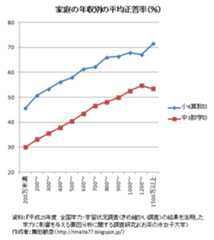 父親と母親の曲線を比べると,後者のほうが少し傾斜が急になっています。子どもと接する時間が長い母親の影響力が大きいのでしょうか。とくに,母親が大卒以上であるかが分岐点のようです。