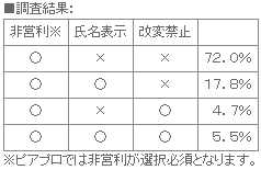 「ライセンス条件の割合調査」として、2007年12月3?2008年1月28日に投稿された作品、計1万2千991件についての集計結果が公開されている。ピアプロへの作品投稿をする際、
