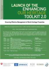 TheEnhancing Our Heritage Toolkit 2.0 (EoH 2.0) provides a globally tested self-assessment methodology to support World Heritage managers and actors to evaluate management effectiveness in a World Heritage property or other heritage place. A management effectiveness assessment is the evaluation of how well a World Heritage property is being managed: primarily on the extent to which the heritage values of the property are being maintained and management objectives are being achieved. The Toolkit supports site managers in identifying ways to improve conservation practices, management processes and resource allocation, particularly if used before reviewing or updating management plans.
