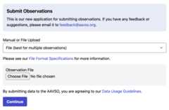 We ask for your feedback in order to help us improve these applications. Please send feedback for the applications above tofeedback@aavso.org. Note: please avoid duplicating submissions across the two submit applications.