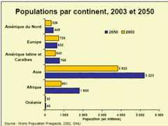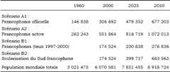 Selon une étude publiée dans lesCahiers québécois de démographie (10), on peut estimer que l'espace francophone, défini sur la base des pays qui ont le français comme langue officielle, comptait 300 millions de personnes en 2000; ce chiffre devrait approcher le demi milliard en 2025 et dépasser 650 millions en 2050. L'avenir de la francophonie reposera de plus en plus sur les pays du Sud, et plus particulièrement sur l'Afrique ; son destin sera de plus en plus lié à des contextes nationaux plus multilingues. Selon la même étude, le nombre de locuteurs francophones, estimé à 175 millions en 2000, pourrait atteindre 680 millions si des politiques volontaristes étaient mises enœuvre pour appuyer les programmes visant à assurer l'éducation pour tous dans les pays du Sud où l'on enseigne déjà en français.Les francophones, qui représentaient en 2000 moins de 3 % de la population du monde, pourraient ainsi voir leur poids démographique passer au milieu du 21e siècle à plus de 7 % de la population mondiale. Quel que soit le scénario retenu, l'Afrique verra son poids démographique augmenter considérablement : alors que moins de la moitié des francophones du monde y vivaient en l'an 2000, on peut s'attendre à y trouver près de 84 % des locuteurs de français en 2050. S'il semble destiné à passer par l'Afrique, l'avenir démographique de la francophonie est conditionné par des réformes des systèmes éducatifs des pays du Sud et la formation accrue de formateurs pour pérenniser une offre d'enseignement en langue française susceptible de répondre à ces évolutions démographiques. Population (en milliers) appartenant à la francophonie