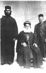 | When I returned, a rickety Ford stood before our door, and the driver, a sad-faced man called ‘Aziz, awaited me. For thirty shillings he would take us there and back. I had heard that the journey to the monastery was a bare hour, and as taxis are usually cheap, I murmured at the price. "But the road is bad," the police intervened anxiously, for they had doubtless arranged matters previously. "Khatûn, ‘Aziz has just paid sixty pounds for his car!" So into the Ford we got, Mikhail delighted because he was going on pilgrimage to a celebrated shrine, Jiddan because Mar Matti is invoked by Yazidis as well as Christians, and a Kurdish policeman who begged that he might come too, for he was desirous of thebarraka or blessing that results from a visit to a holy place. The road was but a track through cornfields and flowers which passed over stream and ditch, following the line of the foothills until it reached the Akkra highway. After that, it turned left towards the mountains, and became steadily worse. In places it seemed likely that the Ford might smash a spring or fall on its side, but ‘Aziz managed to keep it going with a melancholy pride in its acrobatic feats. A particularly vicious spot was just below a village called Bir Banek, where lorries laden with marble from the quarries had worn a deep hole in the road. There and in other places we preferred to get out and walk rather than endure the violent jolting to our spines. At Bir Banek there is abîr (well), a round deep pond covered thickly with green scum. In winter the villagers drink from a mountain stream which crosses the road beside it, but in summer they subsist on the apparently unwholesomebîr. Soon the car descended towards a valley in which two villages, Mergi and Mughara, were to be seen beneath us, each a nest of brown, flat-roofed houses. Both these villages are Christian. Near Mergi we passed a girl dressed in wedding garments, so gay that I regret still not having stopped to take her photograph. Themukhtâr of Mergi addressed us from his house-top in hospitable tones, begging us to enter and refresh ourselves, but, wishing to press on, we thanked him and promised to visit him on our return. Here we left ‘Aziz and his car, and set off on foot towards the monastery set high up against the face of the rock. It was a full hour's climb by the steeply winding mules' path cut in the rock, in places almost a stairway. Twice we paused to rest and regain our breath, once by an oak-tree to which votive rags were tied. We asked of a Kurdish girl stepping lightly down the path what the tree was called, and she replied that it was named "Qatal Lusia", as once a woman named Lusia had been murdered at its foot. A little above the tree a ruined aqueduct chiselled in the living rock had served to bring water from a broken cistern above, and close by was a small olive-grove on a jutting shelf. As we toiled up the last stretch of rock, a small black-clad figure wearing a monkish cap came smiling down to meet us, bearing a pitcher and a glass, and poured me out a drink of clear cold water. The boy, aged perhaps twelve, was a novice in the monastery school. We passed a ruined gate, for the present monastery occupies a smaller space than the ancientdeir and, according to themutrân, the resident bishop, twelve thousand monks were once housed on the rock and in the refectory three hundred sat to eat at a time. Allowing for exaggeration, it is evident that it has seen far more spacious times, since today it shelters but twenty-five monks in all, together with a few boy novices. Climbing various steps and stairways, we were taken at once to themutrân's cell, a falcon's nest of a room, hung as it were in space above the blue champaign beneath. His Holiness, a handsome old man with a patriarchal white beard, sat upon the floor, looking magnificent in his black robe over a scarlet and purple cassock or under-dress, a large gold cross hanging from his neck. Coffee was served, first the thick sweet Turkish brew, and then the clean-tasting bitter Arab, while themutrân conversed with us his guests. He asked, how fared the war? He had seen much trouble and persecution, he said, and recalled that during the Armenian massacres monks had been murdered on the mere score of being Christians. He talked of recent earthquakes and floods in Turkey: he considered them, he said sombrely, a delayed judgement of God upon their wickedness. I protested in vain: "The Turks are now our Allies and these poor people who suffered in the earthquake are not the Turks who slew the Armenians, but simple village folk!" But ancient wrongs lay heavy on his soul and he repeated sonorously, "Fire came from heaven and destroyed them: the earth shook and the floods came! The wheels of the Lord's vengeance turn slowly, the children pay for the sins of the fathers!" It was as if one listened to a minor prophet, and I abandoned the dispute. We were entrusted to a tall young monk with a lively black eye, by name Rahab Daud, that is, Monk David. The lower courtyards, of vast extent, are used for sheep, goats and pack-animals, and a combinedodour of goat and mule hangs about the whole place. We went constantly up and down by steps and roof-terraces: the place is perched on all levels and has an unpremeditated, haphazard effect caused by the fact that it has adapted itself to communities of varying size and epoch, and adjusted itself to vicissitudes of prosperity. The Mutran, Deir of Mar Matti. (The monk Daud on his right.)