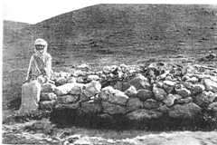"Come!" she said, and began to climb up the smooth rock, putting her foot into crevices here and there. I followed half unwillingly, for I thought of returning. She persisted, "Come, come!" Round the corner were worn steps cut in the rock. Over the boulder a sharp turn to the right brought us into a cavern, the birthplace of the spring, for here it issued from the rock. Ras al-‘Ain: behind the rock in the foreground is the sacred cavern containing the rock sculptures. I give the word as she pronounced it, although a schoolmaster pointed out later that the word iskahaf, meaning simply, "cavern". I am certain, however, that to Sitt Gulé, whose native language is Kurdish, Kaf is the name of the genius of the place. She pointed out his image to me. Within the cave, where the water has worn a deep channel bisecting the floor, a chamber is formed in the natural rock and the hand of man has been at work. Here are niches, blackened by the smoke of votive lamps, shelves for offerings and lights. Three panels are carved within the chamber. One is completely defaced. A second contains a single seated figure facing the worshipper, almost Buddha-like in its dignity and repose, though it is not cross-legged. The figure wears a conical cap, and is seated in a conventional concave frame, shaped like a lotus or flower-bud. The third panel is chipped and defaced, but a seated and bearded personage also wearing a conical cap is plainly visible, also a procession advancing towards him on a wave of movement and worship. A lifted arm holds a dish aloft, but most of the detail has been destroyed. On the floor of the chamber is traced an oblong with twelve small round depressions, placed six a side, possibly a gaming-board. Crossing the stream to the other part of the chamber, one can see on the rock above the spring the damaged full-face low-relief of a head, bearded and wearing a headgear similar to that of the other two figures. A niche containing a lamp of antique pattern is cut into the rock beside it. On my return to Baghdad, I reported these carvings to the Department of Antiquities, which had no record of the place. Two girls followed us into the cave. One said that the figure was Kaf, the other, that it was just the name of the shrine. The water, they said, was always cold, and in summer if they bathed here, it was "like ice". One of the girls, a Moslem but wearing the Kurdish dress worn here irrespective of faith, accompanied us as far as the mill. She was tall, with eyes grey-green like clear sea-water, with black lashes, and an oval face. I remarked upon her beauty when she had left us, with a protective "Mashallah", for one must not praise without invoking the name of God. The next morning Sitt Gulé was to show me more of the shrines. Jiddan and I called for her. She was ready for us and took us first to the largest and most important shrine of Baashika, that of the Shaikh Muhammad al-Huneyfi. It stands at the edge of the village, hard by the modest Jacobite church, which, again, is a bare stone's throw from the ambitious Latin building. It is at Shaikh Muhammad's shrine that the religious ceremonies of the spring feast take place, and the grassy open space before it is used both as fairground and dancing floor. We could not get in: the gate to the courtyard and garden was locked, so we took instead the road to Bahzané. There are two paths to that village, and just where they fork theshaikha paused by amazâr roughly enclosed by a low wall. There was no tomb or cone, the object of veneration being merely a large stone set in the semicircular enclosure. On either side of the stone were a number of broken pitchers and with them a rusty tin can or so, also a wooden spoon carved from a single piece of wood. Sitt Gulé bent to kiss the wall in several places, and a woman, passing and seeing her devotion, paused by us to say that one day when walking by the shrine she had omitted to "visit", that is, to kiss it. "And from that moment," said she, " my eye swelled up and became painful." So saying, she too bent and kissed the stone and walls before reshouldering her bundle and going her way. "This," said Sitt Gulé, sitting on the low wall, "isthemazâr of Shaikh Mus-as-Sor (Mus-the-Red)", and she explained the broken pottery. Those who suffer from itch or any skin affection, visit the shrine bearing water in a vessel. When they have saluted the place, they pour the water on the ground, scrape up some moistened dust, and apply it to the part affected, after which they either break the pitcher, or cast down the vessel, leaving it behind them. "You English," said she, half-smiling, "buy bottles ofdâwa (medicine) from a doctor, but we go to our shrines." Sitt Gulé at the shrine of Mus-as-Sor.
