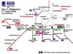 ![]() | In Stadtplänen, die im Westen vertrieben wurden, wurde ganz selbstverständlich der Ostsektor mit dargestellt. Hier ein Netzplan-Ausschnitt, der sich an den tatsächlichen Gegebenheiten orientiert: Die Linien 6 und 8 und die S-Bahn durchqueren den Osten nahezu ohne Zwischenstopp. Die davon unabhängigen Ostlinien sind auch unabhängig durch andere Farbwahlen dargestellt. Hier ein U- und S-Bahnplan in einem zeitgenössischen Falk-Plan von. (Berlin, 38. Auflage)