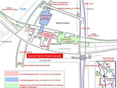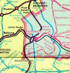![]() | Hier die Umgebung des Bahnhofs Friedrichstraße in einem vom Osten herausgegebenen Stadtplan Berlins. Auffallend die fehlende Darstellung der U-Bahn-Transitstrecke unter der Friedrichstraße und die S-Bahnhöfe auf den "Feldern und Wiesen" jenseits des Brandenburger Tores. Immerhin wird am Lehrter Bahnhof bei der S-Bahn darauf hingewiesen, dass dort ein Grenzübergang ist. In Wahrheit befand er sich natürlich im Bahnhof Friedrichstraße. Bei der Nord-Süd-S-Bahn wird unter der Stresemannstraße auf dieses Symbol verzichtet. Hier: Buchplan Berlin Hauptstadt der DDR, herausgegeben vom VEB Tourist Verlag.