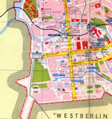 ![]() | Hier ein "Orientierungsplan Demokratisches Berlin" von der Ost-Berliner Innenstadt. Herausgegeben vom VEB Landkartenverlag der DDR. Und hier wirds schon wieder politisch: Die Sternchen-Anmerkung zu "WESTBERLIN" in diesem Plan lautet: "*) Westberlin: Bereich des Besatzungsregimes der USA, Großbritanniens und Frankreichs." Im Übrigen hatte die BVG-West in jenen Jahren auf die Darstellung der S-Bahn in ihren Liniennetzen verzichtet. Der U-Bahnhof heißt ja nach wie vor auch nur "Zoologischer Garten", nicht "Bahnhof Zoo" oder ähnlich. |