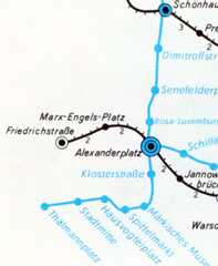 Unter der Chaussee- und Friedrichstraße verlaufend ist die Transit-U-Bahn derLinie C, später Linie 6, und unter dem Straßenzug Brunnenstraße/Heinrich-Heine-Straße die Linie D, später Linie 8, die den Alexanderplatzunterquert, erkennbar. Zusätzlich ist die Nordsüdbahn der S-Bahn dargestellt,wie sie sich ihren Weg vom Potsdamer Platz zum Nordbahnhof durch den Ostsektorsucht. In diesem Plan sind im Gegensatz zu späteren Auflagen noch alleBahnhöfe als geöffnet erkenntlich, so als sei die Grenze noch offen. Ebensosind grenzüberschreitende U-Bahnlinien dargestellt, die längst außer Betriebwaren. Mit diesem Plan aber wird deutlich, wo welche Bahnhöfe im Osten gelegenhaben. Daher eignet sich dieser Planausschnitt sehr gut, um die Örtlichkeitenzuordnen zu können.