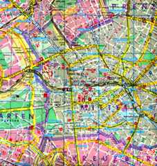 ![]() | Ganz anders dagegen ein in der DDR vertriebener Stadtplan von "Berlin, Hauptstadt der DDR". In ihm ist "Westberlin" nur als eine weiße Fläche dargestellt. In diesem U- und S-Bahnnetzplan scheint Berlin an der Friedrichstraße und am Thälmannplatz zu Ende zu sein. Ebenso wird auf die Darstellung der Transitstrecken der Westberliner U-Bahn völlig verzichtet. Im Hauptplan hingegen sind die Westberliner S-Bahnlinien dargestellt, was aufgrund der damaligen politischen Situation der Westberliner S-Bahn nahe liegend ist. Hier ein Stadtplan von Berlin, herausgegeben vom VEB Landkartenverlag der DDR.