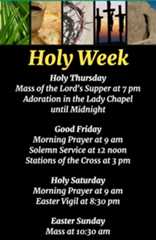 Daily Mass will be celebrated Monday through Friday in the Cathedral at 12:10 PM. Please consult the bulletin for announced changes due to holidays and other events.