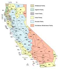 | Athabascan Family Oregon Group 1a. Rogue River Tolowa Group 1b. Tolowa. Hupa Group 1c. Hupa 1d. Whilkut Matole Group 1e. Matole Wailaki Group 1f. Nongatl 1g. Lassik 1h. Shelter Cove Sinkyone 1i. Lolangkok Sinkyone 1j. Eel River Wailaki 1k. Pitch Wailaki 1l. North Fork Wailaki 1m. Kato Bear River Group 1n. Bear River Algonkin Family Yurok 2a. Yurok 2b. Coast Yurok 3. Wiyot Yukian Family 4a. Yuki 4b. Huchnom 4c. Coast Yuki 4d. Wappo | Hokan Family Shastan 6a. Shasta 6b. New River Shasta 6c. Konomihu 6d. Okwanuchu 6e. Achomawi (Pit River) 6f. Atsugewi (Hat Creek) Yana 7a. Northern Yana 7b. Central Yana 7c. Southern Yana 7d. Yahi 8. Karok 9. Chimariko Pomo 10a. Northern 10b. Central 10c. Eastern 10d. Southeastern 10e. Northeastern 10f. Southern 10g. Southwestern 11. Washo 12. Esselen Salinan 13a. Antoniano 13b. Migueleño 13c. Playano (doubtful) Chumash 14a. Obispeño 14b. Purisimeño 14c. Ynezeño 14d. Barbareño 14e. Ventureño 14f. Emigdiano 14g. Cuyama 14h. Island Yuman 15a. Northern (Western) Diegueño 15b. Mountain Diegueño 15c. Southern (Eastern or Desert) Diegueño 15d. Kamia 15e. Yuma 15f. Halchidhoma & Kohuana (now Chemehuevi) 15g. Mohave | Penutian Family Wintun Dialect Groups 16a. Northern (Wintu) 16b. Central (Nomlaki) 16c. Hill (Patwin) 16d. River (Patwin) Maidu Dialect Groups 17a. Northeastern 17b. Northwestern 17c. Southern (Nisenan) Miwok 18a. Coast 18b. Lake 18c. Bay (Saclan) 18d. Plains 18e. Northern Sierra 18f. Central Sierra 18g. Southern Sierra Costanoan 19a. San Pablo (Karkin) 19b. San Francisco 19c. Santa Clara 19d. Santa Cruz 19e. San Juan Bautista (Mutsun) 19f. Rumsen (Monterey) 19g. Soledad Yokuts Dialect Groups 20a. Northern Valley (Chulamni, Chauchila, etc.) 20b. Southern Valley (Tachi, Yauelmani, etc.) 20c. Northern Hill (Chukchansi, etc.) 20d. Kings River (Chionimni, etc.) 20e. Tule-Kaweah (Yaudanchi, etc.) 20f. Poso Creek (Paleuyamni) 20g. Buena Vista (Tulamni, etc.) Modoc 20h. Modoc | Uto-Aztekan (Shoshonean) Family Plateau Branch Mono-Bannock Group 21a. Northern Paiute (Paviotso) 21b. Owens Valley Paiute 21c. Mono Lake Paiute 21d. Monache (Western Mono) Shoshoni-Comanche Group 21e. Panamint Shoshone (Koso) Ute-Chemehuevi Group 21f, Chemehuevi (Southern Paiute) 21g. Kawaiisu (Tecachapi) Kern River Branch 21h. Tübatulabal (& Bankalachi) Southern California Branch Serrano Group 21i. Kitanemuk (Tajon) 21j. Alliklik 21k. Möhineyam (Vanyume) 21l. Serrano Gabrielino Group 21m. Fernandeño 21n. Gabrielino 21o. Nicholeño Luiseño-Cahuilla Group 21p. Juaneño 21q. Luiseño 21r. Cupeño 21s. Pass Cahuilla 21t. Mountain Cahuilla 21u. Desert Cahuilla |