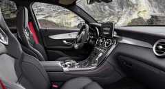 Inside, AMG gave the GLC a sportier atmosphere with a flat-bottom, part-leather, part micro-suede steering wheel, sport seats, red sticking and seat belts, and a revised instrument panel.