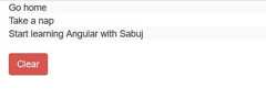 <div> <div> <table> <thead> <tr> <th>To-Do list</th> </tr> </thead> <tbody> <tr *ngFor="let todo of todo_array"> {{todo}} </tr> </tbody> <tfoot> <tr> <button (click)="clearToDo()">Clear</button> </tr> </tfoot> </table> </div></div>Go to the browser to see that we have a better to do list now. Also, notice the markup that we have used thead, tbody, tfoot instead of just using plain th, tr, td. We also placed the clear button inside tfoot.