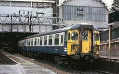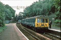 Above, at Kirkhill in 1979, is a Glasgow area EMU of the type known originally as the 'blue trains' due to their unique, at introduction, livery. The flat windscreens were a modification; originally the outer two screens wrapped around the corners. The 1960 Cambridge scheme would have required 112 three-car units based upon this design. Had the scheme come to fruition, the Glasgow-type units would have been used mainly on inner suburban services to, presumably, Welwyn Garden City and Hertford North.
