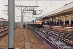 Above we see Class 86 electric locomotive 86401 at Cambridge on 23 March 1987. The locomotive had been repainted in NSE livery specially for the occasion, which should have taken place on 19 January but had been postponed due to severe weather conditions. The train was a special working for publicity purposes and had covered the run from Liverpool Street in 48mins. This was good going as the Liverpool Street line is not an easy one and is plagued by speed restrictions due to congestion at the London end. For a few years the wires ended at Cambridge and a handful of Class 86 locomotives, five it is thought, were drafted in to operate King's Lynn services which, as mentioned, were dire following electrification to Cambridge. There was just three or four per day with the electric locomotives being replaced by Class 47 diesels for the section north of Cambridge. At other times of the day, King's Lynn had to make do with a DMU shuttle between there and Cambridge. Usually, 3-car Metro-Cammell units were in charge.
