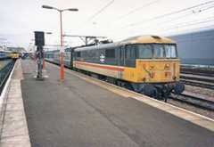 Above, on an unknown date in 1989 an NSE liveried 8-car EMU headed by 310059 is seen at Cambridge. Presumably it will use the scissors crossing to access platform 1 and take up a service to Liverpool Street.. On the right is either a Class 317 or 321 EMU.