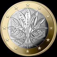 In 2022 France introduced a second series of €1 and €2 coins. The new design features oak and olive branches that form the tree of life and symbolise strength, solidity and peace. The tree and the motto stand within a hexagon.