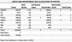 The following table shows the allocation to parties within Santa Ana Department in 2012 (there were no independent candidates or coalitions) utilizing the largest remainder system with a Hare quota. ARENA and FMLN first won 2 seats apiece for full multiples of the Hare quota. The last 3 seats went to CN, ARENA and GANA because these parties has the largest remainder votes (i.e. not used to win a seat for a full quota).