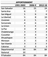 The following table shows the apportionment of seats in El Salvador from 1990-2018. Each department is guaranteed a minimum of 3 seats.