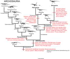 For all their diversity, however, pseudosuchians are dwarfed by their ornithodiran sister taxa.Basal ornithodirans differed from typical diapsids by havingelongate lower limb elements, suggesting that they were even faster than typical reptiles. All (except perhaps for the most primitive) had cervical vertebrae greatly modified so that they look very different from dorsal vertebrae, but instead could allow theneck to form an S-shaped curve (hence the name of the group).