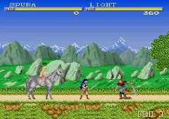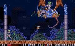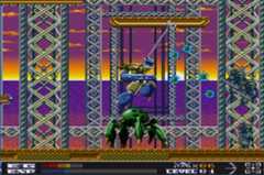 Playing like a cross betweenAssault Suits Valken and Bionic Commanda, Aquales is an incredibly awesome side-scrolling action game with multiple layers of parallax scrolling and a thumping heavy metal soundtrack. Levels are wildly diverse, including an ocean platform at sunset, an underwater ship with transparency effects, a Grecian coliseum and a futuristic speeding train. Each has multiple weapons to be found within, one of which spits antigravity flames that speed along walls and ceilings! There's also swords and chainguns. For a full examination click the title above.